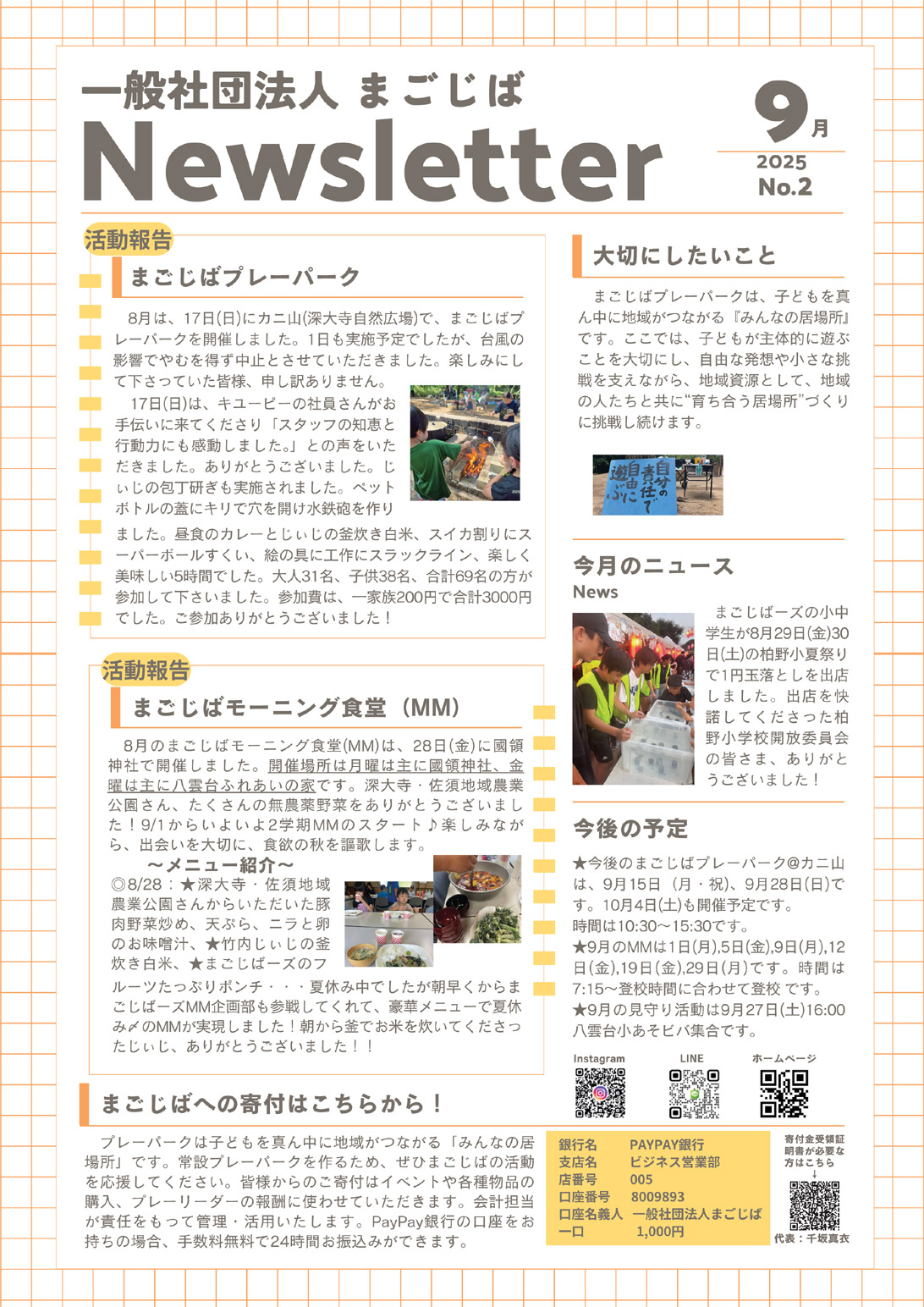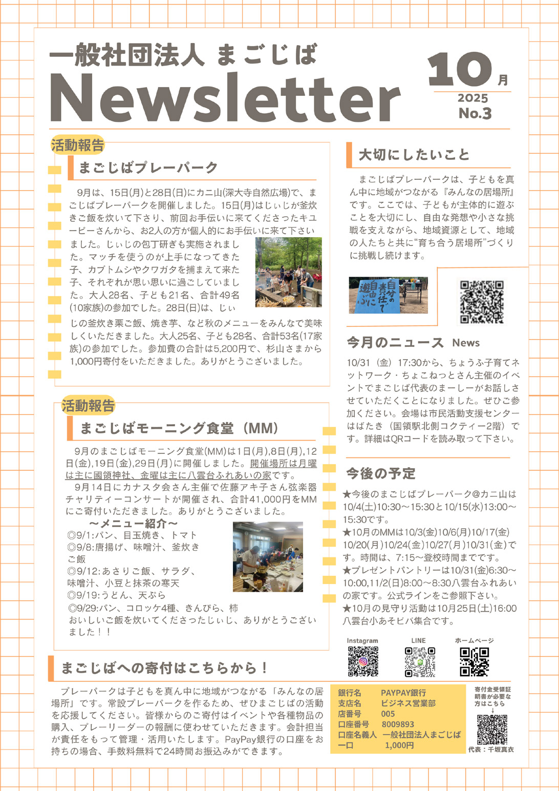 お知らせ 2025.10.10 目次 各種事業の開催についてニュースレター 各種事業の開催について イベントについては、公式LINEや公式インスタグラムをご覧ください。 ニュースレター 2025年8月: No. 1JPG (500kb)PDF (1.3MB)2025年9月: No. 2JPG (500kb)PDF (1.1MB)2025年10月: No. 3JPG (500kb)PDF (1MB)