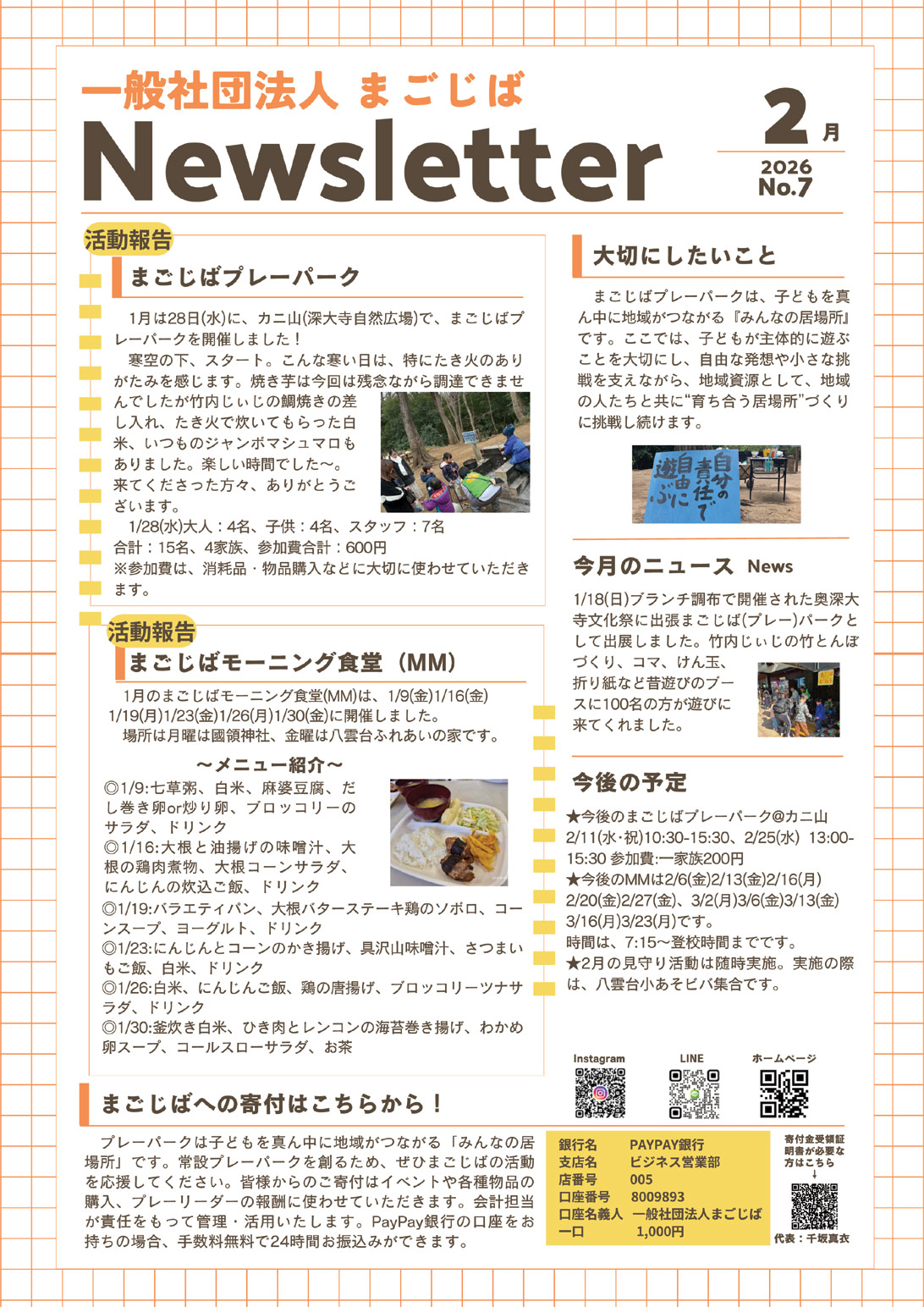 お知らせ 2026.02.02 目次 カレンダー&イベント各種事業の開催についてニュースレター カレンダー&イベント 各種事業の開催について イベントについては、公式LINEや公式インスタグラムをご覧ください。 ニュースレター 2025年8月: No. 1JPG (500kb)PDF (1.3MB)2025年9月: No. 2JPG (500kb)PDF (1.1MB)2025年10月: No. 3JPG (500kb)PDF (1MB)2025年11月: No. 4JPG (500kb)PDF (1.4MB)2025年12月: No. 5JPG (500kb)PDF (1MB)2026年1月: No. 6JPG (500kb)PDF (1.5MB)2026年2月: No. 7JPG (500kb)PDF (800kb)