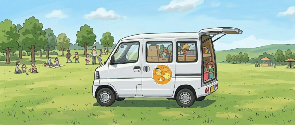 出張プレーカーとは、遊び道具や素材を積んだ車で地域へ出向き、その場を「自由なあそび場」に変える取り組みです。